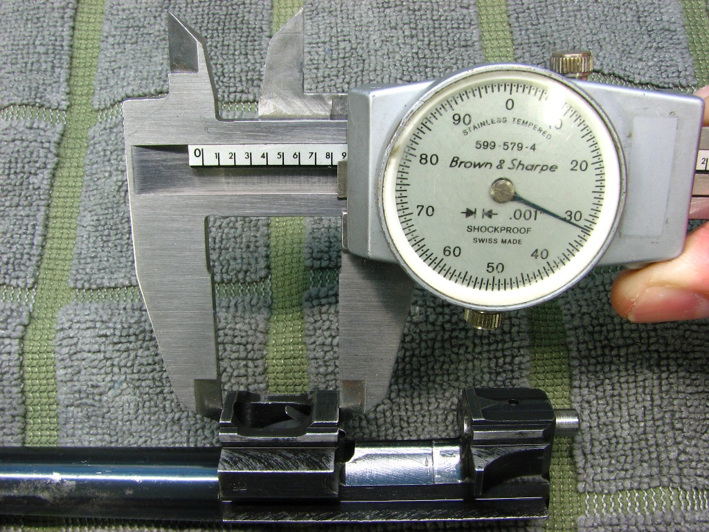 Since an unserialized slide is hard to come by, the old serial number on pistol 8765 was removed by buffing or grinding. As a result, the left side slide rail is thinner than the right. This can be seen by the naked eye when the slide is removed and viewed upside-down. Measuring the slide with a micrometer verifies this.