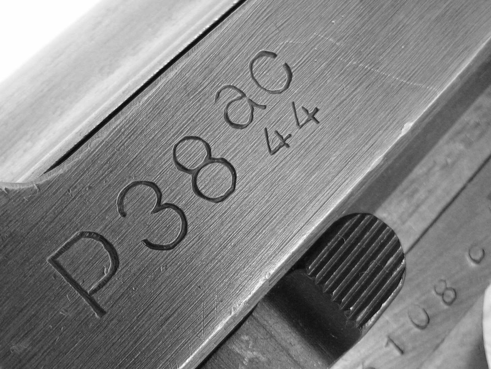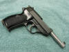 Mauser byf44 with slide made by FN. Blued finish on the frame and some small parts. Various shades of phosphate finish on the remainder of the pistol - darker on the slide and some small parts such as the slide stop, magazine catch, and magazine. Very thin to no finish on the barrel and trigger. Mauser plastic grips.